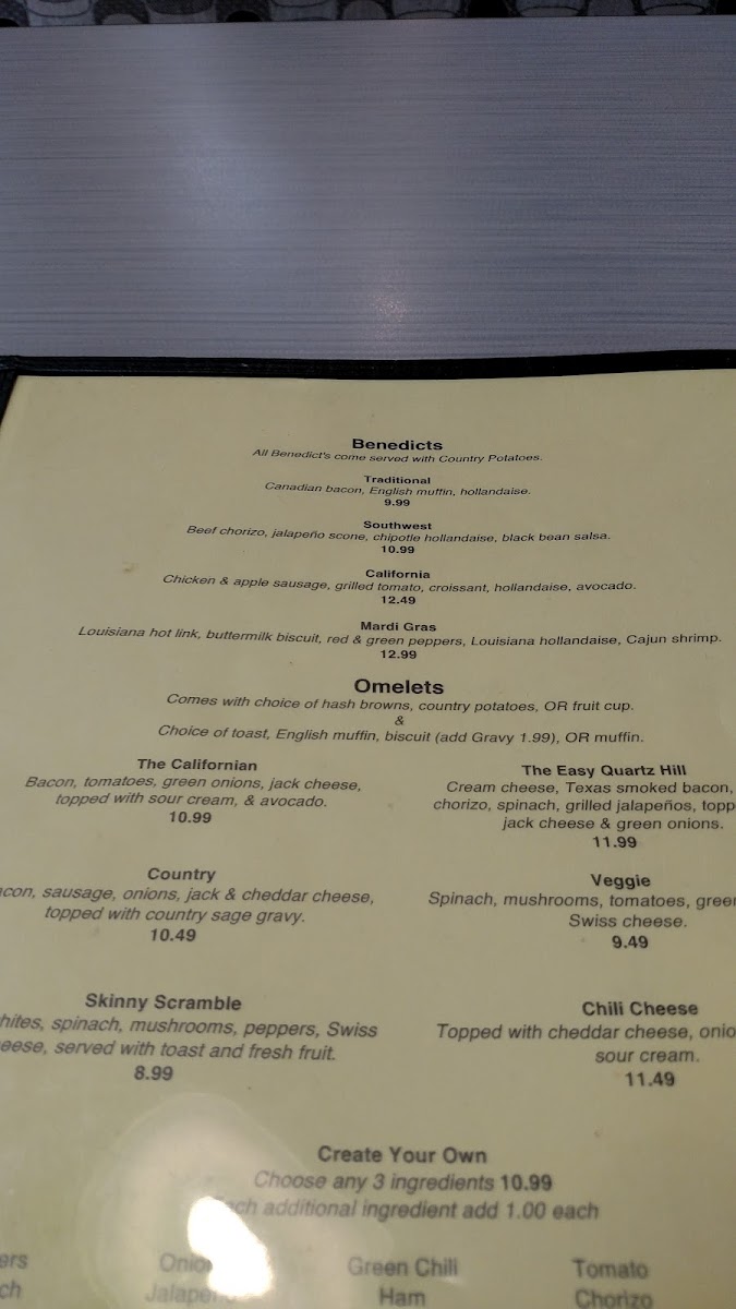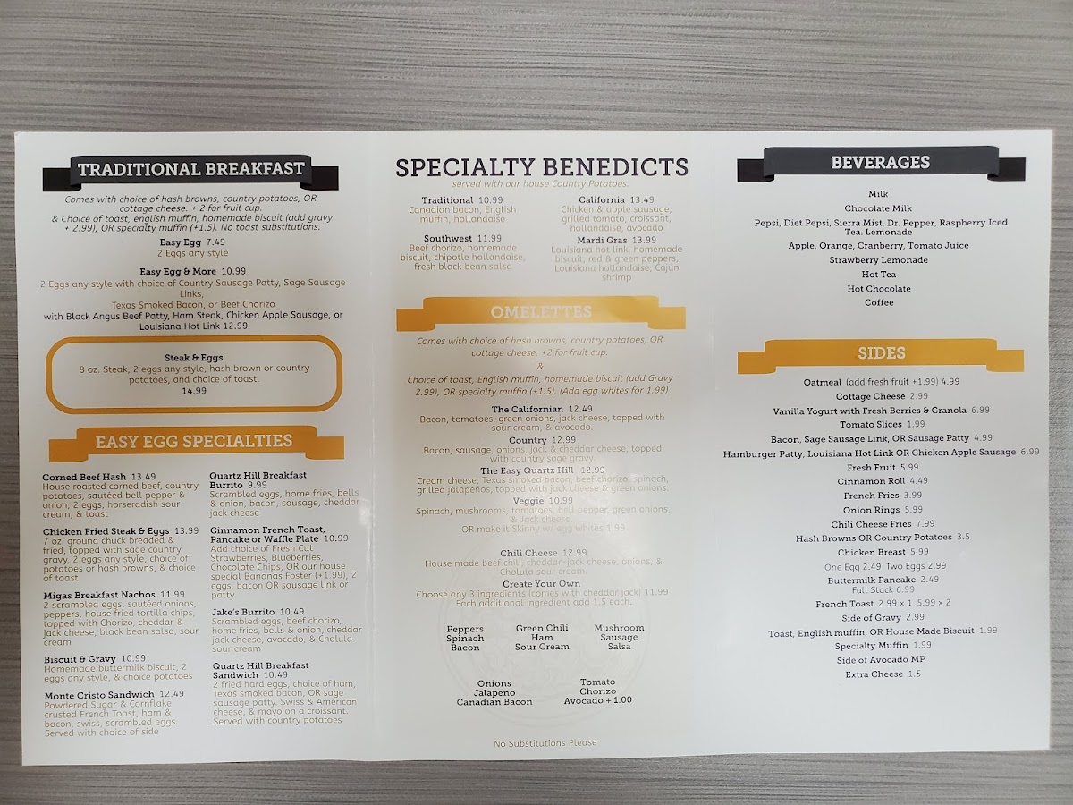 Skillet style - Scrambled eggs, hash browns, cheddarjack cheese, ham, bacon, sausage, sauteed bell peppers & onions. Topped with green onion.