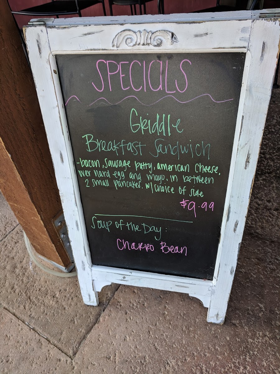 Scrambled egg, bacon, chorizo, housemade chili, tater tots, onions, cholula sour cream, jalapenos, and cheddarjack cheese. All wrapped in a flour tortilla, and served with a small cup of fruit.