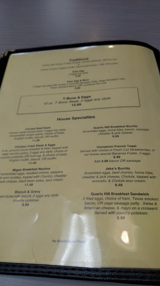 7 oz. ground chuck breaded and fried, topped with sage country gravy, 2 eggs any style, choice of potatoes or fruit cup and choice of toast.